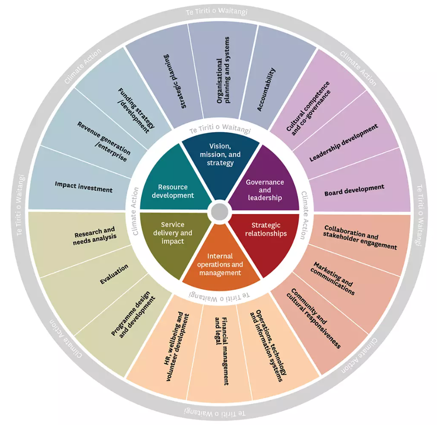 Each segment provides links to resources available in each broad category of development, to help community organisations access the knowledge, skills, instincts, abilities and processes they need to operate effectively and achieve impact.